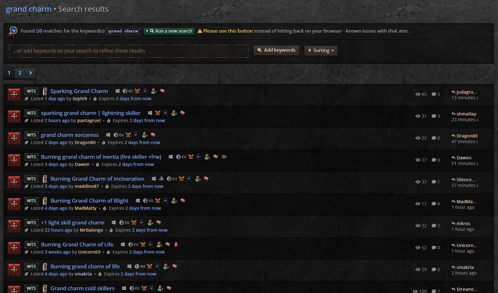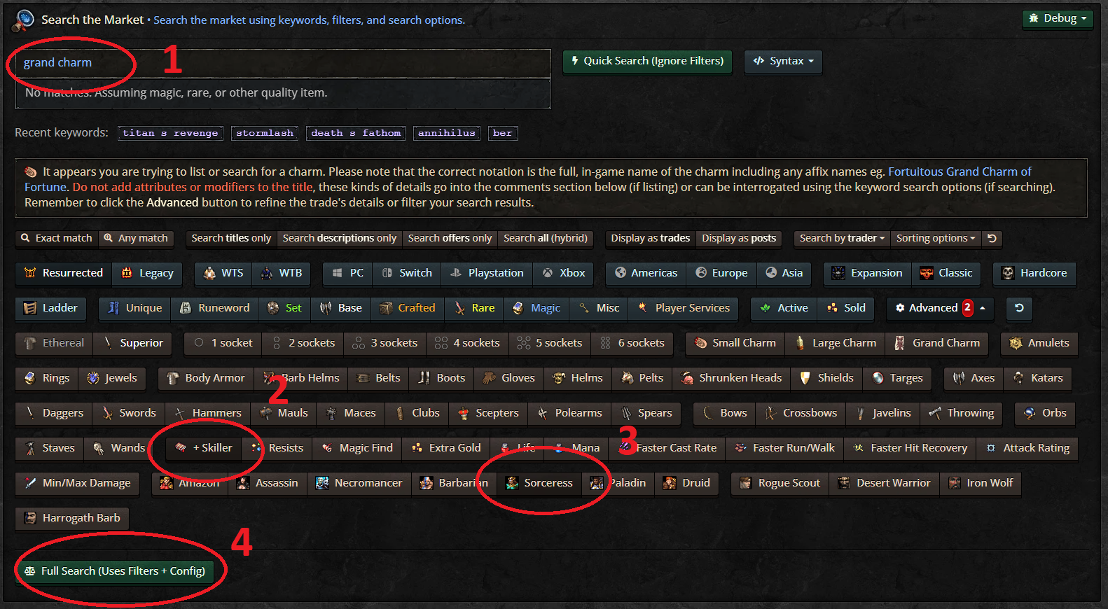There is an advanced category for grand charm + skiller. Right now, the best way to list your item is to list the full in game name, along with the effects in the post. You could also add some extra text to the end of your title.