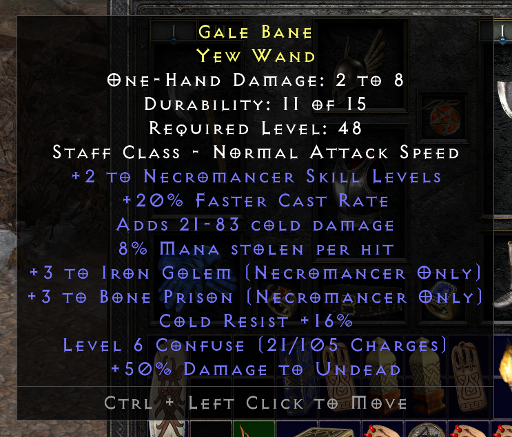 Rare Necro weapon - +2skill, +3 Iron Golem, +3 Bone Prison, 20FCR, 8ML, Cold dmg & Cold res + Confuse