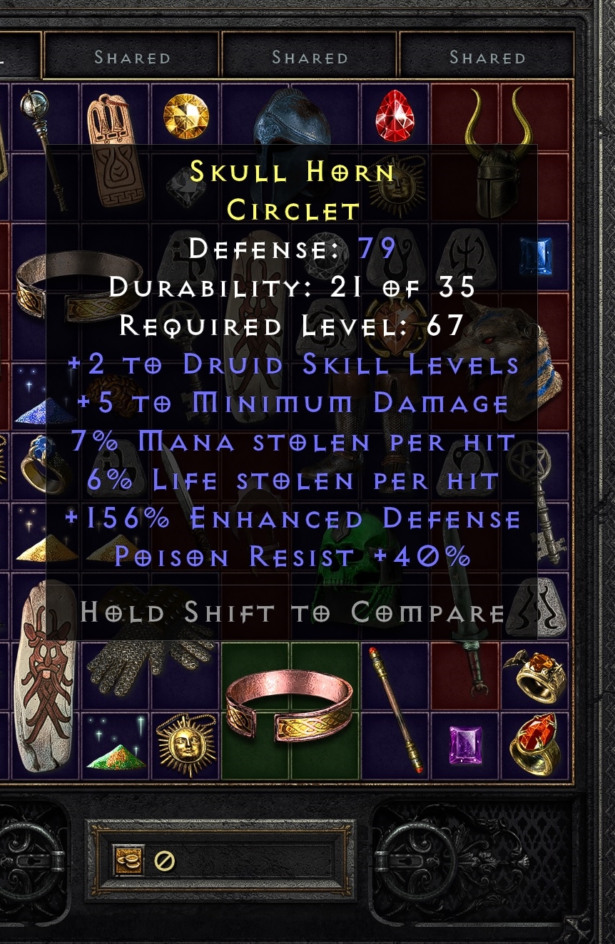 2 druid skills, 5 minimum damage, 7 mana + 6 life leech, 40 poison resist, thanks