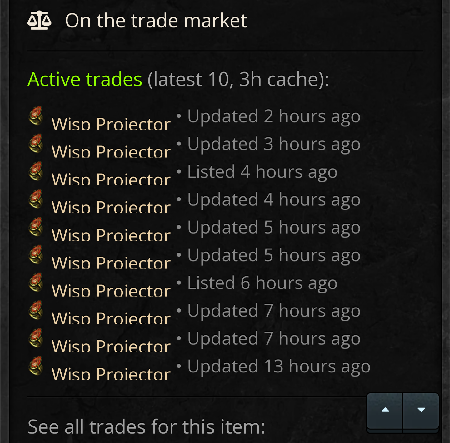 Anything else to add: If you look at the hyperlink text of " Wisp Projector" in the top 10 market results on the page for the ring itself (on mobile, at least), the text is partially cut off at the bottom and positioned too far down in relation to the icon of the ring and the rest of the text. It does not occur on all item pages necessarily, but it does occur on certain ones.