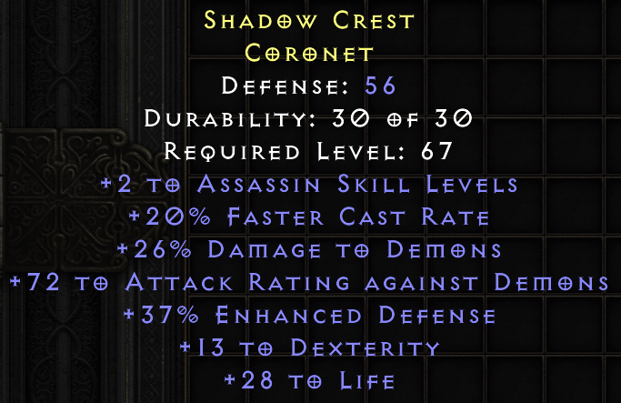 Unfortunately assassins don't really benefit from FCR as traps use attack speed stat to determine the speed with which they are set. dex and life rolls are decent, not great so i'd put this at Lum or pgems. Also the required level being fairly high means it isn't useful for leveling either.