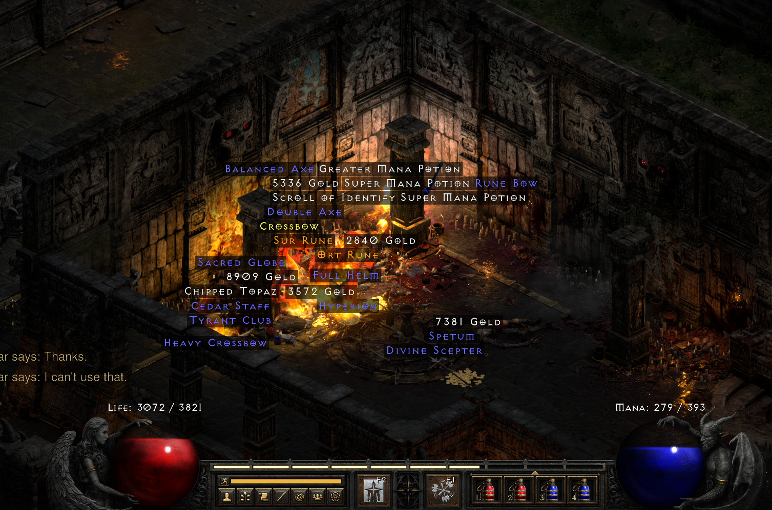 Actually, I would like a tip about Travincal- what do you do you Trav barbs do to keep your Merc alive? Right now, I'm still going the budget route- I gave him a Guardian Angel, Crown of Thieves, and 3 OS Tomb Reaver (socketed with 3 Amn runes for 21% life leech). He still seems to die sometimes, even with 33% life leech! Quite an achievement.