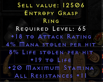 Eh. 2 perfect rolls (AllRes and LL). Stamina is worthless, AR is extremely low. Life is less than half. Maybe a 3-point? For min level 65, I'd say pretty low trade value. Maaaybe Gul? I wouldn't pay that much, but someone might; dual leeches are desired.