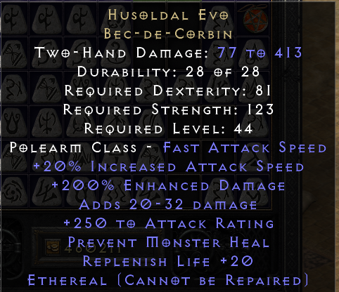 It's only an exceptional item, and even if you upgraded it to a Giant Poleaxe base it still only has 200%ED which is much less than any other decent Elite polearm. So unless someone wants it for a collection I would say nothing at all.