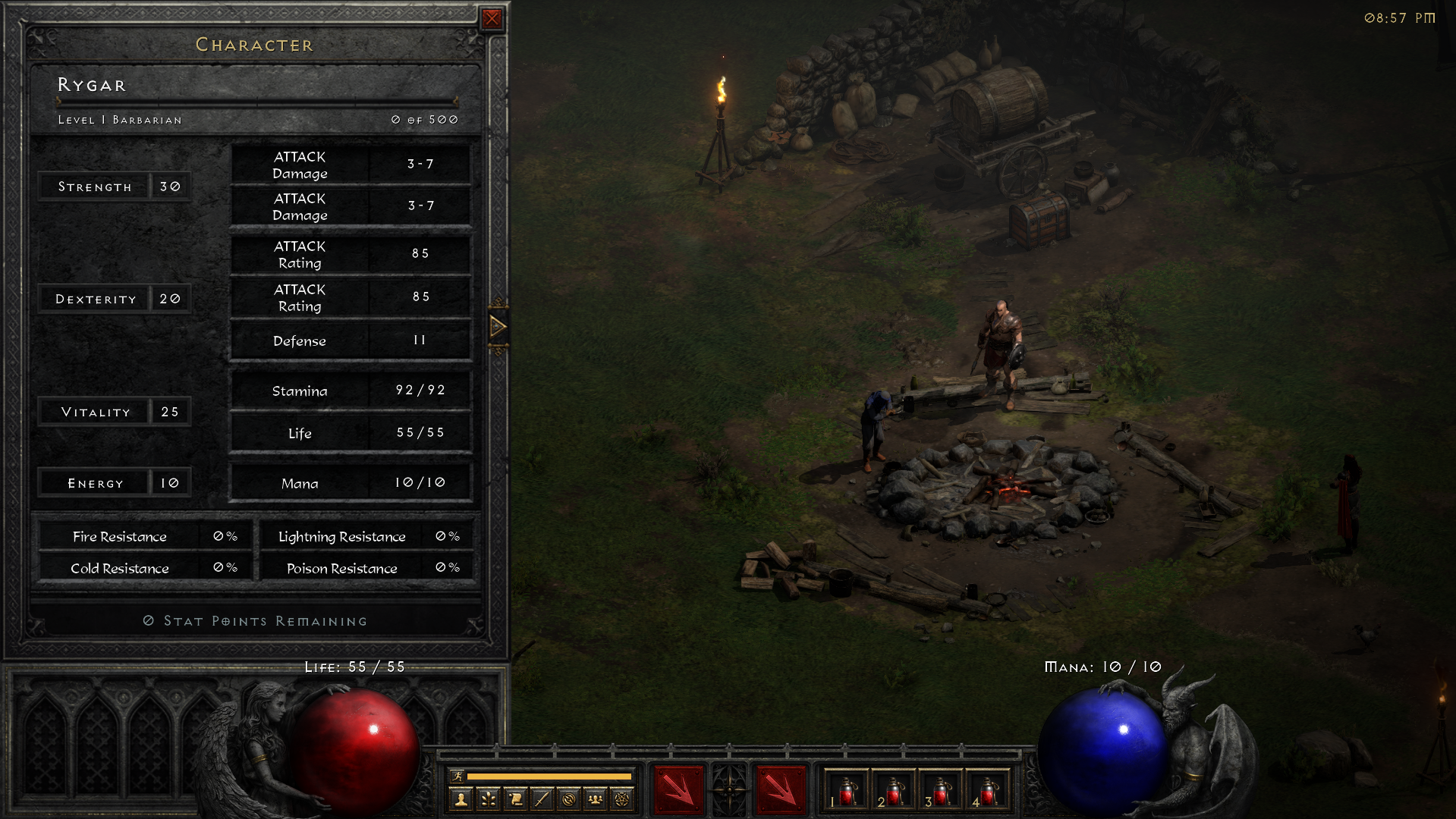 At Lvl. 1 he will always start with: 30 Strength, 20 Dexterity, 25 Vitality, and 10 Energy. Any time you put a point into one of these attributes, it will increase the numbers correlating to them - adding a point into Strength increases his physical attack damage, while adding one into Dexterity increases his attack rating and chance to block (if he's using a shield). Depending on what kind of Barbarian you're trying to build, the number of points put into Strength and Dexterity matters a lot. Speaking of attack damage and attack rating, lets talk a little bit how that works: Attack Damage: In the Barbarian's case, he deals Physical Damage, always. This is only not the case if you equip him with a weapon that deals an elemental damage in addition to its physical damage type. There are 4 types of elemental damage: Fire, Cold, Lightning and Poison. The more strength you give your Barbarian, the more damage he'll do! But raw strength isn't enough, he'll need a good weapon to really land those powerful blows. Attack Rating: Attack rating is what helps your Barbarian hit those pesky monsters he's trying to slay. If his attack rating is too low, he'll simply miss his target, even if it's right in front of his face. Dexterity helps increase his chance to hit monsters, but depending on what kind of Barbarian you're trying to make, you want to be careful how many points you put here. There are a plethora of items a player can choose to increase their characters attack rating, but for the Barbarian, his best choice (early on and even sometimes into early end game) is The Angelic's Amulet and Rings. These will help greatly increase your Barbarian's attack rating, as it scales with his level.