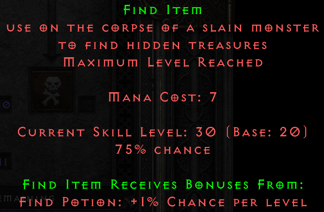 Yeah now I want to know where the sweet spot if for skills. currently I have 20 pts into Find Potion and only 2 into Find Item. Running a full inventory of wc eg gcs with 2lemmed +3wc warswords so i have +21 to all skills to get 73% after Battle Command....