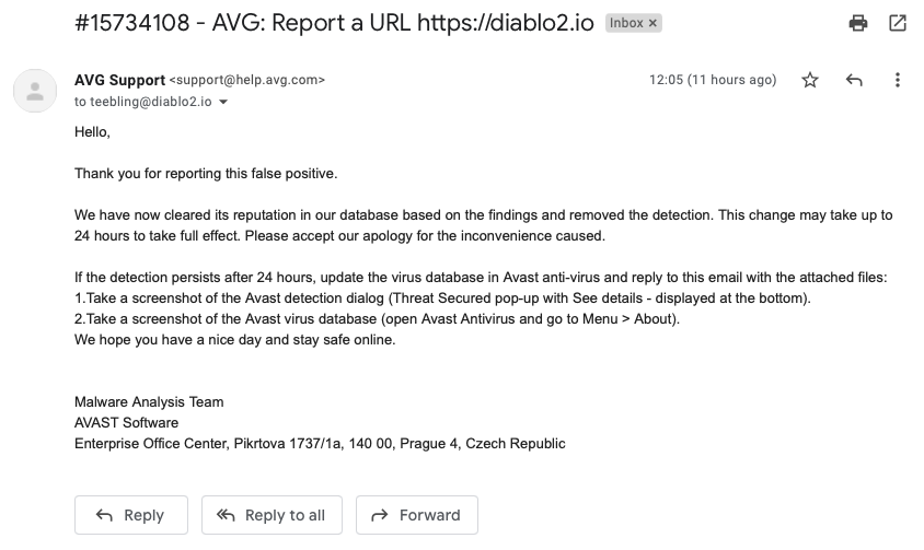Just an update guys, both Avast and AVG have now reviewed the site and removed diablo2.io from their databases. Turns out this was indeed a false positive.