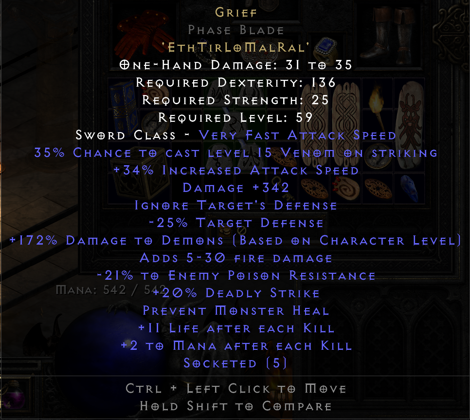 Honestly think I'm going to stop rolling Grief. This is my fourth try. I might as well light my runes on fire.cristobal03 wrote: 3 years agoHave rolled 3 Grief since D2R, all sub-360 dam, all sub-35% IAS, never a max life per kill. Driving me nuts.