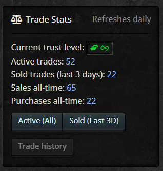 I've seen several posts in the last few weeks with users complaining about not getting the sales/trades that they're expecting when using this site. I've seen posters try to pin the blame on the website or the 1.0 update, the D2 'economy', or even on other players. As a result, I decided to put together a list book of sales tips for using this website and understanding the buying and trading in Diablo 2: Resurrected. To provide some validation on my tips, you can see my site stats below. I'll point out that more than 30% of my total sales have happened in the last 3 days alone. Tips for Selling
