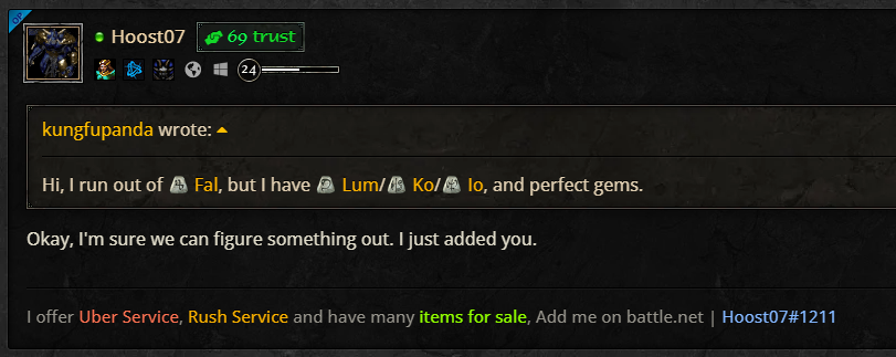Are you still listing trades on the forums? Or not listing your services in the correct category? Your post is just going to get removed or moved to the correct category anyway. Save the mods time and trouble by using the correct forum when posting price checks, discussions, trades, player services, etc. - Use the player squelch feature