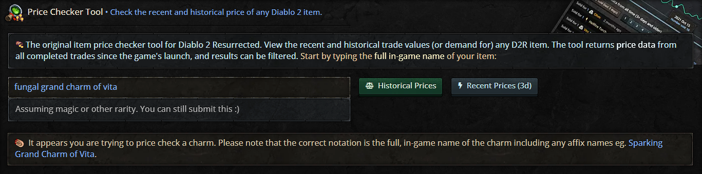 Ah, thank you so much, I was hitting "Enter" not realizing you can just click the buttons too. Many thanks for your advice!cristobal03 wrote: 3 years agoYou can type the actual name of any item in the price checker tool at the top of the board to get a price history: