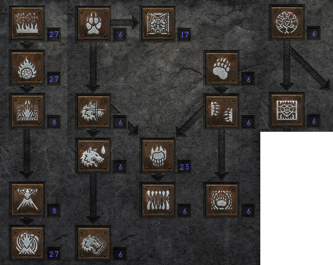 Thanks for the image. Can't see myself using Fire Claws... I like Fury much more, and it hitting fast is Key to procing fissures. I'll have to test skill loadouts, see when Fury and geddon are both strong enough. I may have enough skills to invest some in Fury too, if I go max geddon it's 81 skills, Fury is 5, 86, and a 85 character has 96 skills... last 11 will have to go to Fury/ Fissure(more geddon duration)/ Werewolf, maybe for more needed ias. Also, the Key might be mixing natural and ss charms... who knows. Will try.Runasutaru wrote: 3 years agoEarth Shifter should be really cool, especially after 2.4 amplified the physical portion of Fire spells. As for Fury, that has worked just fine for me with only one hard point, and I'm not even running any Shape Shifting skillers. It's weak, but it's good enough for when it's necessary. Here's how my skill-point distribution looks — keep in mind I'm in my MF gear right now: