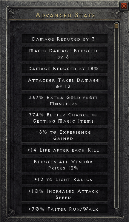 But uniques are just a fraction of the total valuable items you can find in D2. At least ~50% of my Wealth comes from non-uniques/rares that magic find does not affect at all: blue jewels, charms, mid and high runes, runeword bases. So, assuming magic find helps you find only half of your item Wealth, 774% magic find vs 350% magic find would only net you 17.6%/2 = 8.8% more Wealth per run of whatever you're running. So if your clear speed is even just 10% slower than the same character build with 350% magic find, then you're already hurting yourself by overstacking to 774% MF.