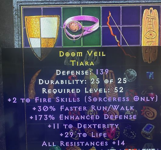 +2 Fire Skills; 30% FRW; 173% ED; +11 Dex; +29 Life; All Res +14 (see img)