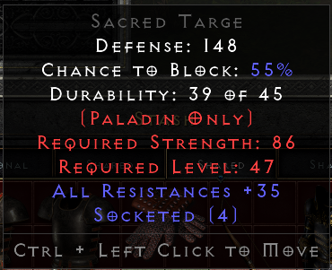 Depending on your build and the remainder of your gear, you're forced into a fair bit of dex anyways (e.g. Phase Blade reqs). Couple that with a high enough lvl of Holy Shield and you don't need a sacred target for more block as you're quite possibly base-capped anyways, even with a lower base block on your shield.
