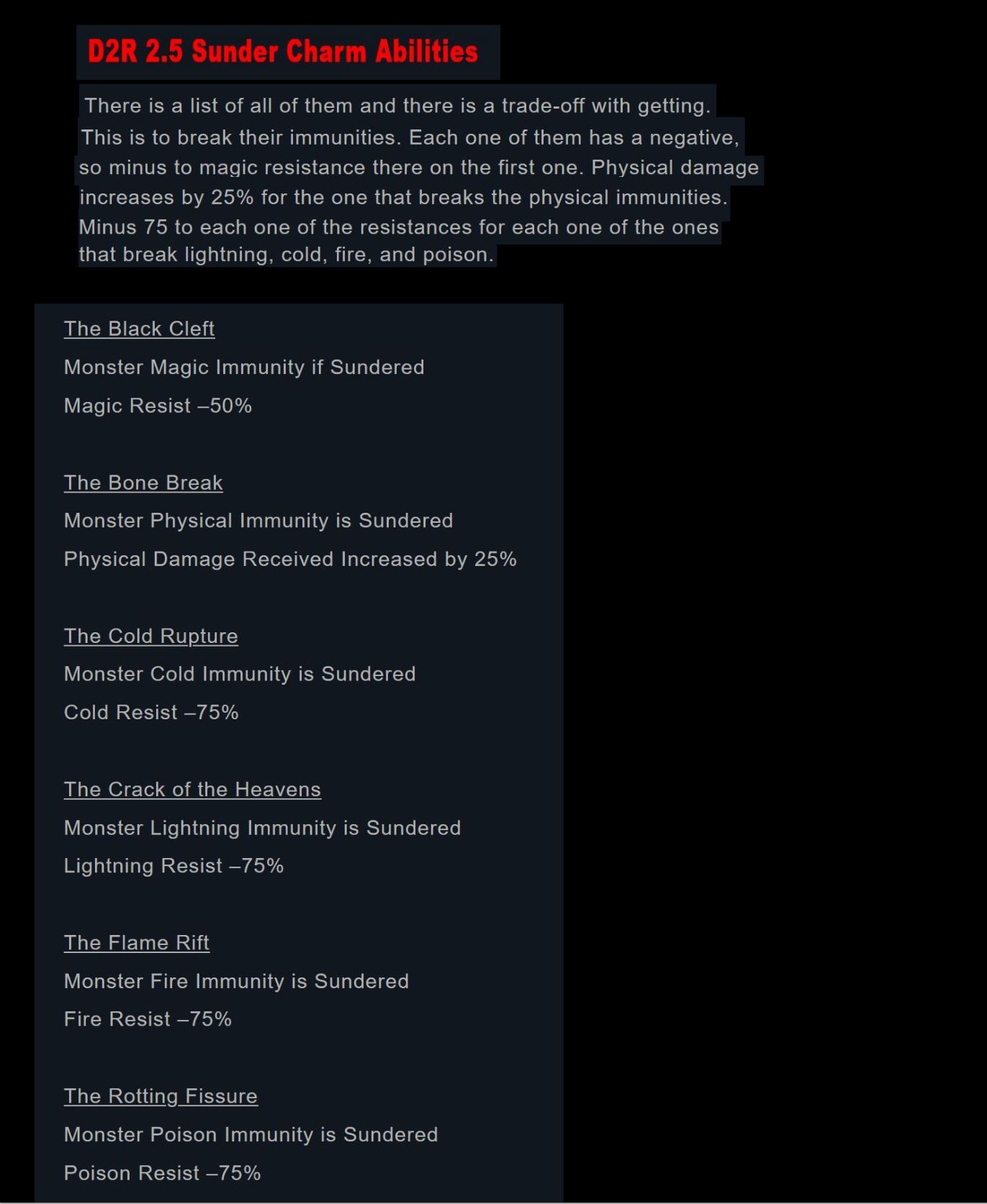 Here you make it quite clear that physical damage builds need help. My point was that physical damage builds are the least impacted by sunder charms because there are so few physical immune monsters in the game.louner wrote: 3 years agoAlso physical damage builds remain broken, trapsins are also neglected. I guess physical builds would have to run around with amp damage charges / Atma scarab proc or deal 5% of regular damage instead. Nice.