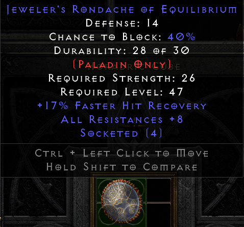 thank you for your response as always! Appreciate it!atari wrote: 3 years agoAs far as I know jeweler's shields aren't used by paladins and are only really worth something when they have increased blocking chance. I also checked the price history but there's not a single jeweler's Rondache listed (pricecheck.php?item=Jeweler%27s%20Rondache&other=1). So even with higher res it would have no value.