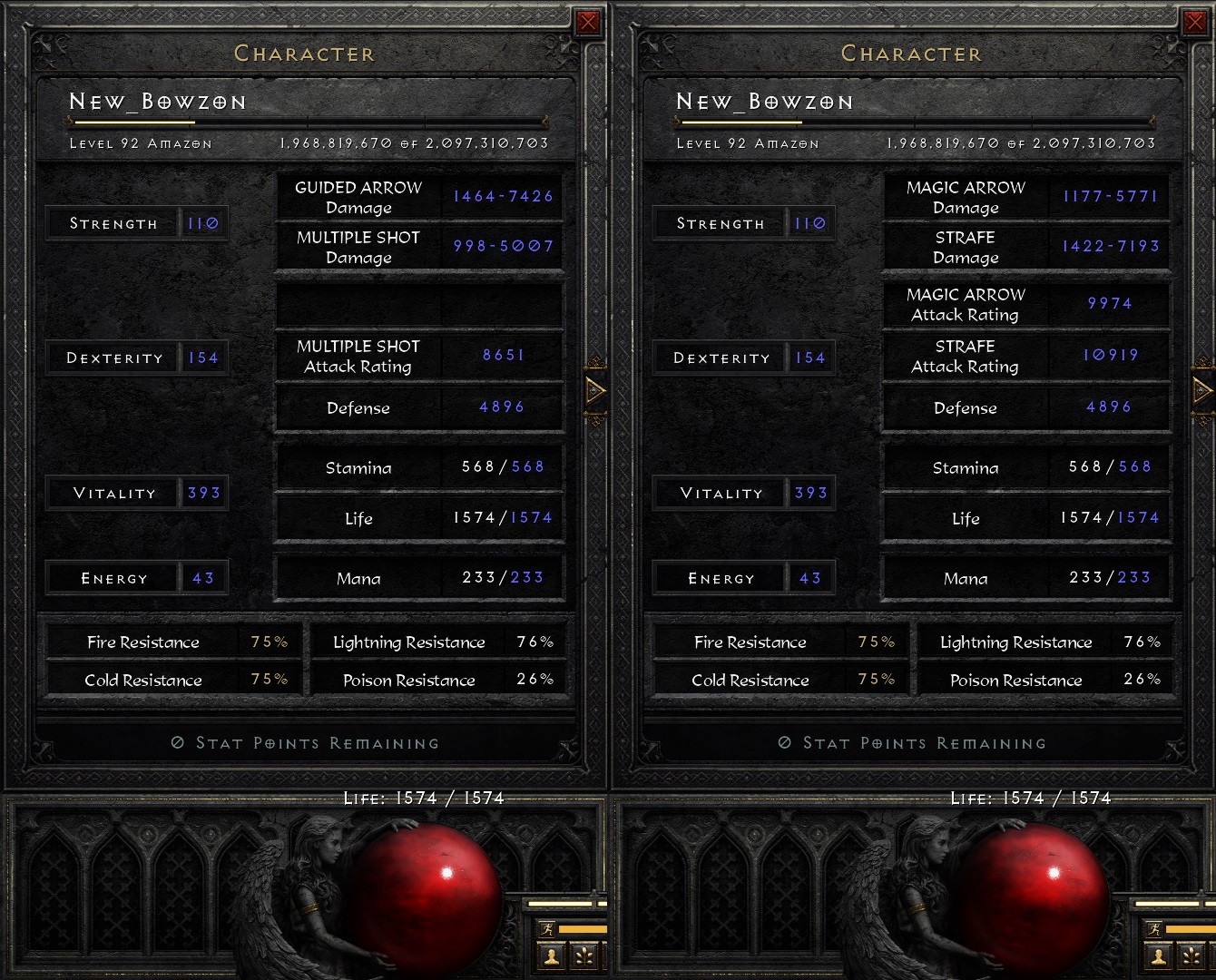 I had all my stats listed here before but I felt like it was petty and starting a dick waving competition I didn't want to start. Needless to say I'm around 7k max damage for Strafe and guided and around 5k damage for multi shot. Well enough damage for leech to fill both health and mana quite rapidly.mhlg wrote: 3 years agoPerhaps it depends on your bow and stuff? I have a perfect Faith GM bow and a Windforce. My Windforce has a higher Dps in my stats but Faith beats it in reality. In my experience there are no other Zon skills that can match the survivability of Strafe because leech keeps both health and mana topped. Multi and Guided are both Strafe synergies so you will max them out as well. I can choose any of them but multishot is a mana hog and not that good at leech. I find leech requires both speed and damage. I also have an Andy's socketed with 15 IAS 36 ED jewel, Nostferatu coil Belt, and Laying of Hands mitts.