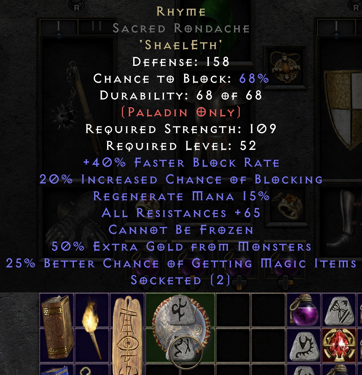 The interesting part is the base, which is a 40 all res sacre Targe. Unfortunately with 2os it has no value.