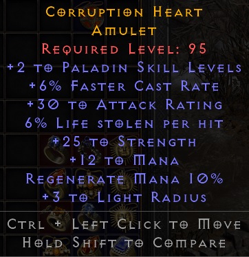 A: +2 skills and +25 strength are nice, 6% life leech might be useful for a melee pala but attack rating isn't a good affix on an amulets in my opinion (max is only 50 while rings can have 150). Maybe a Mal or an Ist.