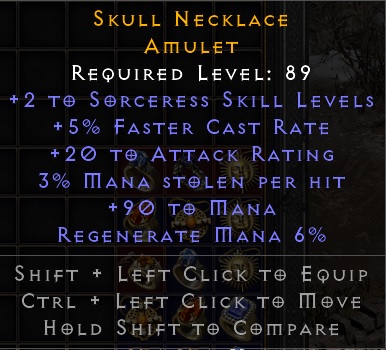 B: +2 skills and +90 mana are nice but attack rating as well as mana leech is pretty useless for sorcs. I would say only Pul or even less.