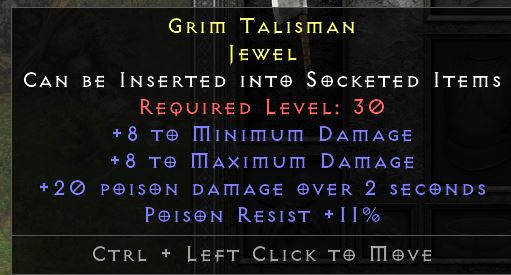 PC on this jewel +8 Min dam + 8 Max Dam +20 Pois over 2 Pois resistance 20% Level Req 30