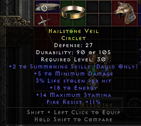 +2 Summoning skills, 3% life stolen, 11% fire resist
