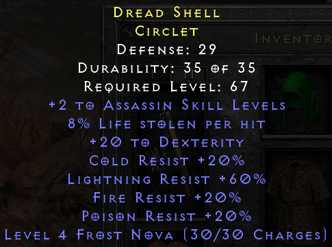Rare sin circlet, 8 life leech, 20 all res/60 lightning, 20 dex