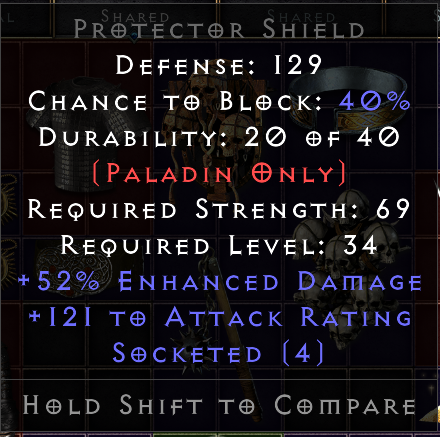 Thank you m8 !atari wrote: 3 years agoIMHO no value. Protector Shield is only the Exceptional version not the elite version and max for %ed on a paladin shield is 65% ed. Also all res automod is preferred by most people instead of %ed.