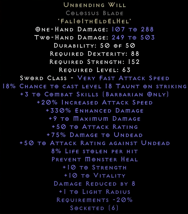 While this runeword can be used by any melee character, it is especially aimed at Act 5 Mercenaries. Since it needs a 6 Open Socket Sword the bases are somewhat limited so it will most likely be made in an Colossus Blade (preferably ethereal if used by a Barbarian Hireling)