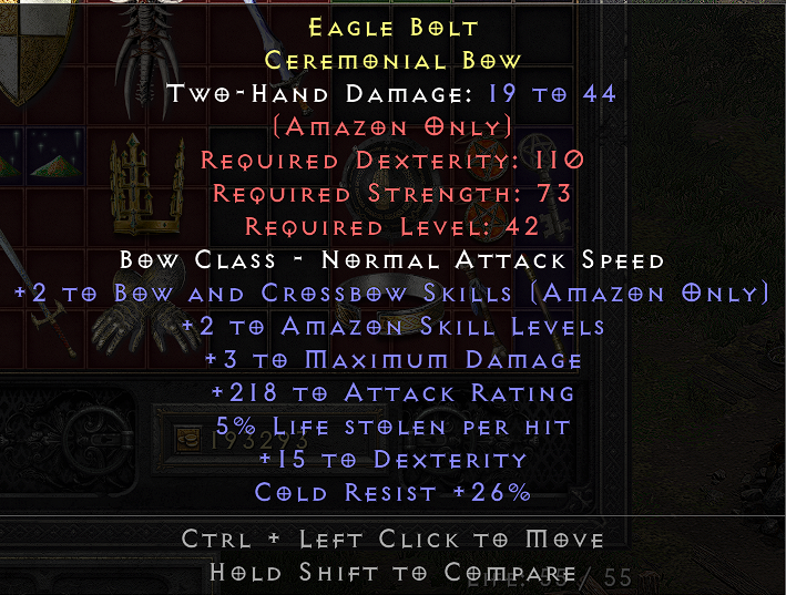 Ceremonial Bow +2Bow/+2Ama/+3 Max damage/+218 AR/+5%LL/+15Dex/+26CR