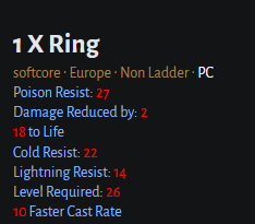 Just looked at the charsifood link @atari posted. All else aside, anything that sigmas over 3 for a specific use case is worth at least Ber and will usually auction for considerably more. I hadn't thought of the lvl 30 dueling bracket. This is an absolute monster ring for that. OP, if you haven't sold, you might consider listing at other sites; low-level duel listings don't seem to get much attention on d2io (in my experience). gl