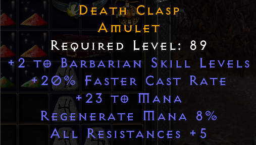 Barb: 2/20 amulet is always great and valuable. The all res is low (could be 20) and so is mana. Probably around 2 to 5 Ber.