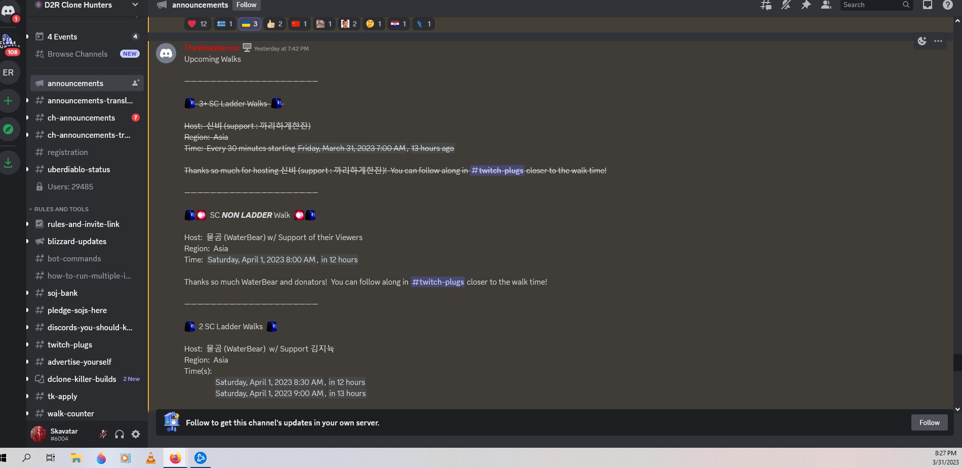 no, this morning walks already happened(Mar 31 in Americas). this is a new walk for Apr 1 Americas. all info is from D2 Hunters Discord. i just took a screen shot for reference.osoviejo wrote: 2 years agoShould that be April 2nd?mockingbirdreal wrote: 2 years ago6 walks tomorrow starting at2023-04-01T11:30:00This timestamp has been automatically converted to your local date/time for convenience. The format is DD/MMM/YYYY, HH:MM am/pm. This is based off your browser time. then every 30 minutes.