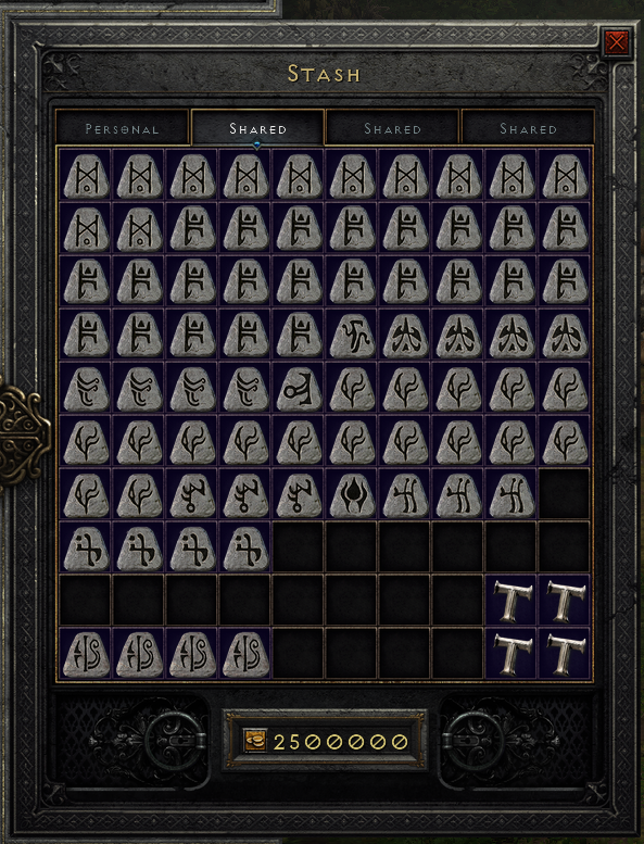 Good God. This is what my stash looks like now after this last few weeks of the most insane luck anyone could hope for- all while also gearing out my toons. I thought having this much Wealth would ruin my joy of finding items worth "merely" mid-runes, but I still got a nice dopamine hit from the Andariel's Visage Baal spat out last night. To put this in perspective for me, I ended all the previous seasons with like, 2 to 4 Bers worth of excess runes. That said, the bots have run wild this season and a Ber ain't what it used to be.