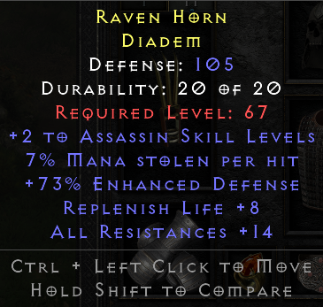 IMHO Raven Horn has no value since it has nothing special (like fcr, frw, 2 sockets). A Harlequin Crest or an Andariel's Visage is better.