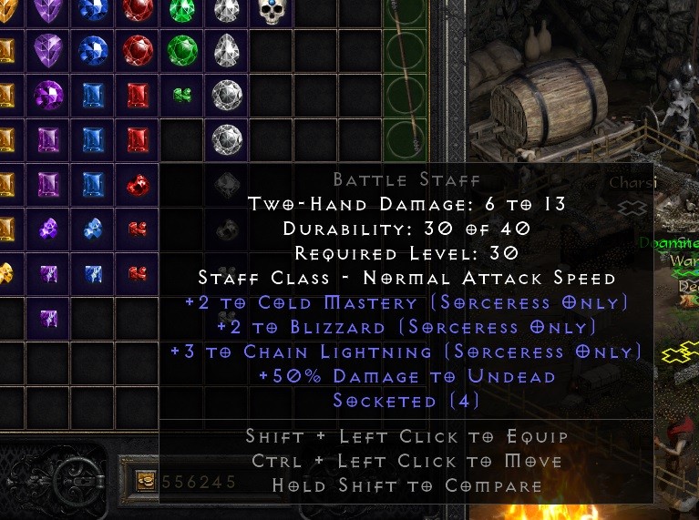I did a Doom rune word with that Cham rune I found last week, a perfect roll straight away (-60%)! I will see what damage my blizz sorc will make now!