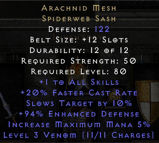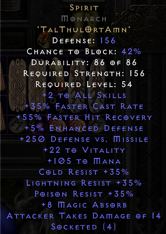 Got an Arachnid Mesh and Skullder's Ire on the same day for my first offline character before I found a Monarch for Spirit that rolled 35% fcr first try
