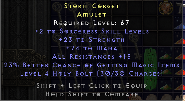 Weird amulet, most sorcs want FCR on it, as unless Mara is usually better unless... But high STR + MF + Mana + Res is an interesting combo.
