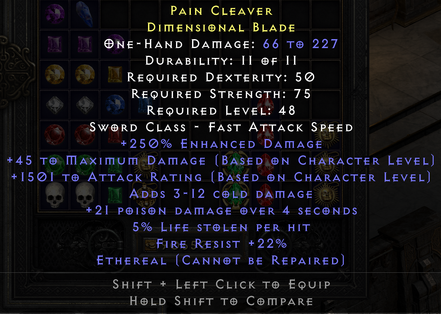You need +37IAS for breakpoint as barb on a Phase Blade and as Smiter you need +33 IAS so that means u need atleast 20IAS on it, with 2os your fine with Shael Lo but sometimes Shael will work if it has 20IAS because u really need to hit that 37 IAS with it equipped, fools mod is what u want combined with cruels, fools mod is used to Penetrate the high armor = attack raiting, cruels is used for vs casters with the ED but Fools combined with cruels 280+ ED is very good for melee leagues, and urs would be considered a good placeholder for around ~25k fg if urs had 40 IAS and remove the poison dmg that bugs ur dmg output with sc, just like max dmg mod would bug the ed on head with 40/15 jewels.