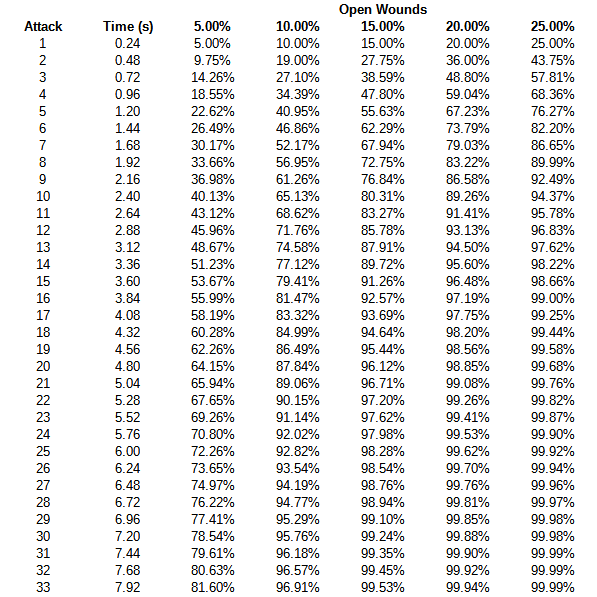 As a result, when you look at the actual odds of re-applying open wounds before it runs out, you get the following (assuming 6 frame
