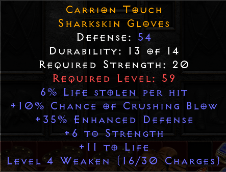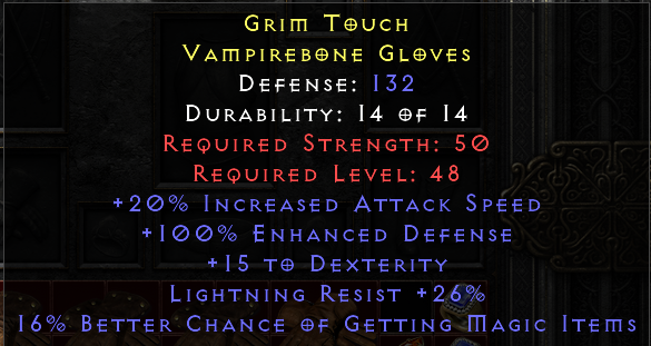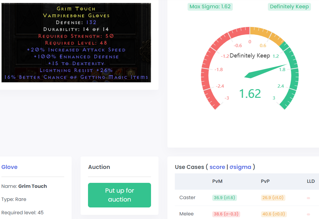 @Flippy The high sigma for Grim Touch from d2charsifood comes from caster but caster will prefer Magefist / Trang-Oul's Claws. For gloves look at the melee value on d2charsifood and there the sigma for Grim Touch is pretty bad --> Charsi.