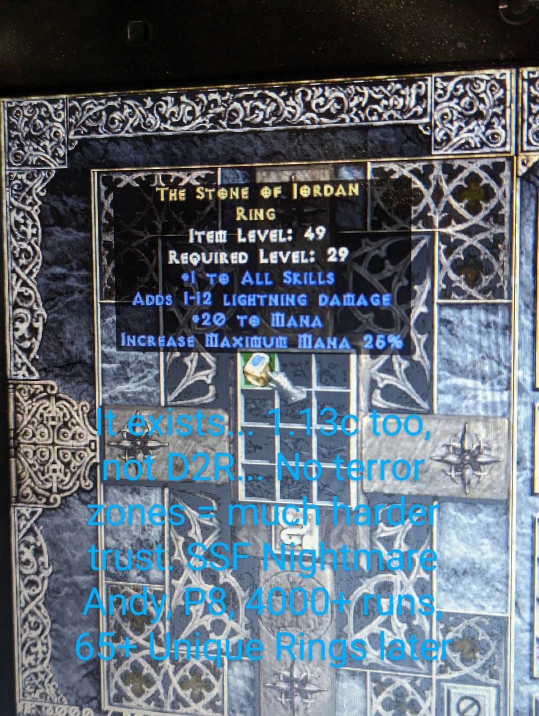 But this morning, on actually my 2nd run of the day, doing Nightmare Andy on P8 on 1.13C, I finally got my first ever SSF SoJ Ring. 4000+ runs of NM Andy, and 65+ unique rings later, finally. I almost had a heart attack. Oh and just fyi I have been playing for 23 years, or however long it's been since the game was released. I was playing before LoD existed.