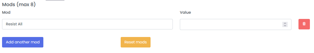3. Click the Add another mod button until you have enough fields to enter all the roll types and values. Be careful here; some things can overlap, e.g. a light res roll of 41% is really one light res affix and one resist all affix. There are some tips and logic on the site to help with proper determination of affixes and splits in this situation: