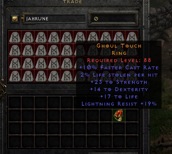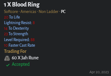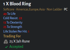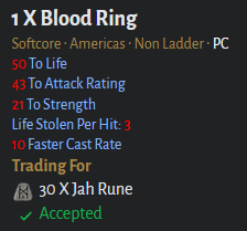 That Traderie listing isn't a Blood Ring? There's no life steal stat. I seriously doubt the 60 Jah price, I've seen better blood rings on Traderie for lower value, and that's only with double life affixes, e.g.