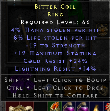 Not a bad ring, but also not amazing. Perfect life leech, decent mana leech. Very good str. The cold res is also very good, and light res is on the border. When it comes to resistances, the relative value is: lightning has most value, then fire, then cold, then poison has the least.