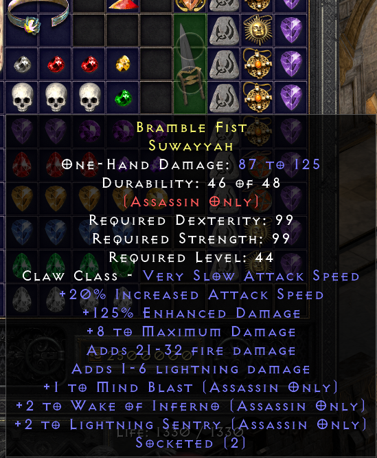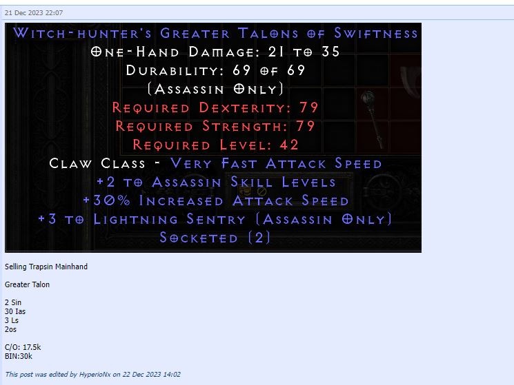 And for trapsin you will always use 30-40ias and +5 trap 2sin 3ls with 2os or will just use Plague without +5 trap 30+ ias in a Greater Talons , Suwayyah , Battle Cestus or Runic Talons you will just use a Plague. this works for rare Claws to but they need 2os for value and the stats mentioned.