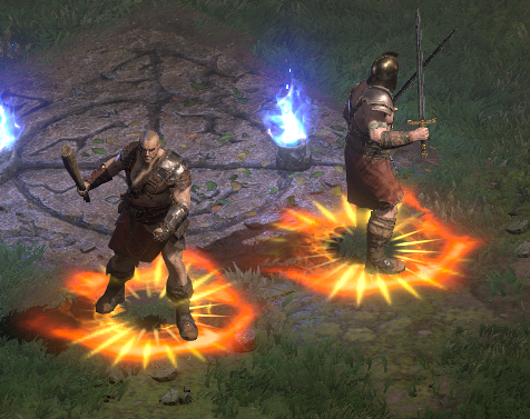 Buuut just for the sake of confirmation and whatnot, say hello to Folcwald: That's flickering, Last Wish, Bramble and Hustle. So Resist Fire, might, Thorns and Fanaticism. All 4 auras are active (both visually and confirmed functional) for both, the merc and the barb next to him.