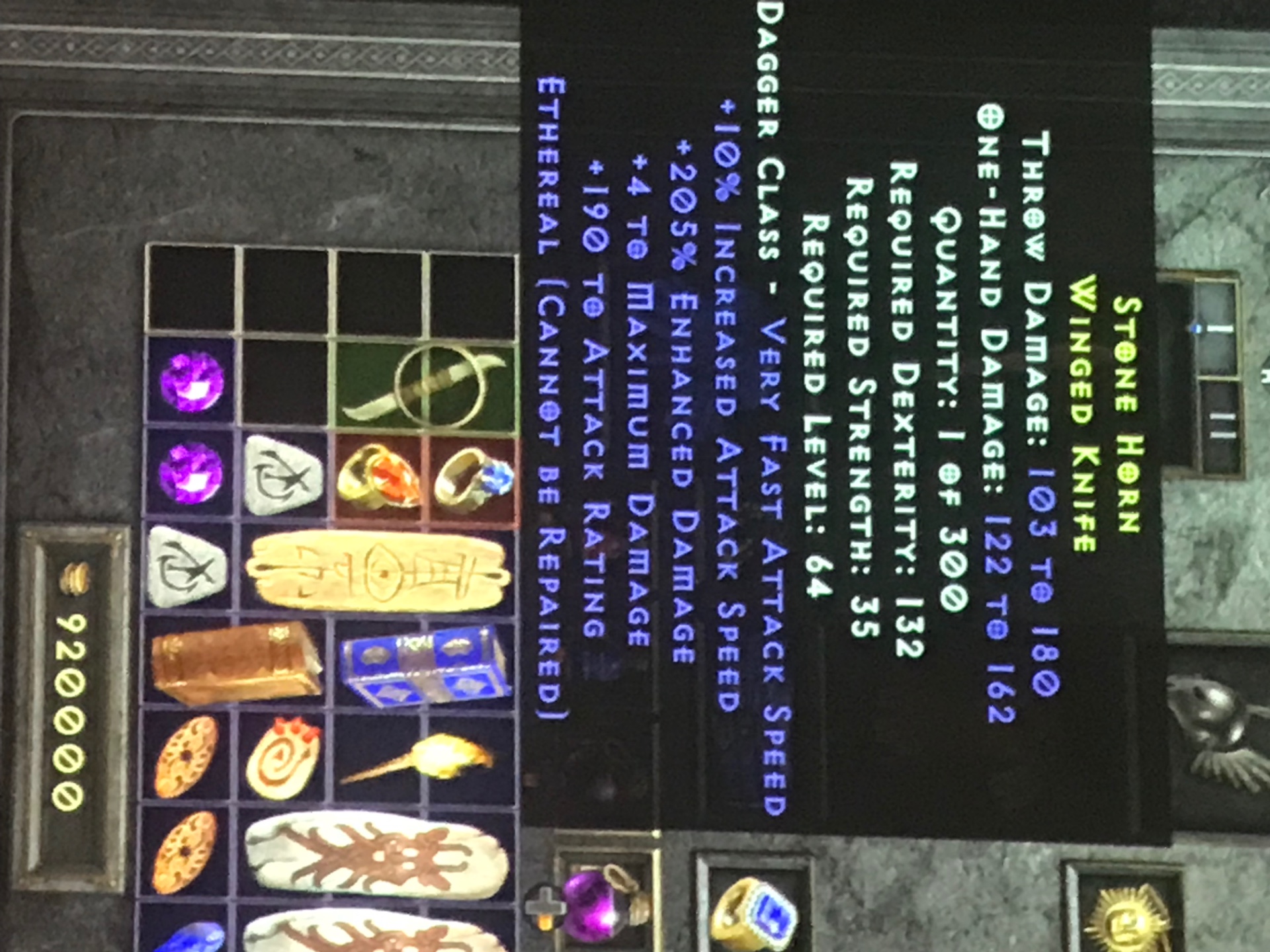 So, in one trav run, I dropped a perfect maras and also a rare knife that was ethereal with 205 Ed. I’ve been looking for decent Eth throw weap for my barb for weeks and finally got it. However I upped it, and noticed a problem…