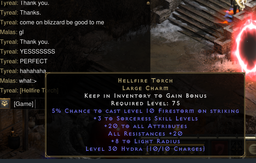 Well, not so much me as my friend. We were doing ubers. I had two Key sets, he had one. My first was a druid. Fine, cuz I needed it. Then we did his. It was an okay Amazon one he didn't want. So I said I'd take it because I again needed one. So I took it and gave him my second Key set so he could retry. And we did. Aaaaand he gets a perfect sorc torch. This like a week after he finds a Jah doing cows with me. I have yet to have a high rune drop for me in cows, but he finds one on the other side of the map...